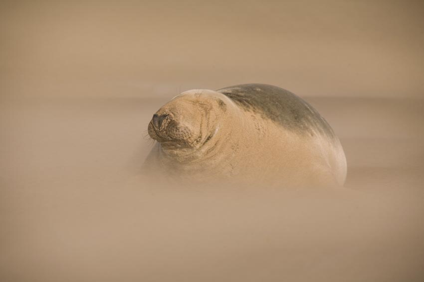 As I draw nearer to the seals, I can start to see them as small lumps in the distance - the first time I know for sure that this isn't going to be a wasted trip! Understanding animal behaviour is an important part of wildlife photography and I spend some time just watching seals. Some of this knowledge can be taken from books and the internet but there's nothing quite like being there first hand. The weather can be changeable at Donna Nook but today it seems to be pleasant, still with the sun lying low creating a lovely warmth to the area. I tend to arrive at a location with pre-conceived ideas about the pictures I would like to capture so I set my cameras up and start exploring the seals, looking to isolate individual subjects at first. It's important to remember that these are wild animals - used to people, yes - but wild nonetheless and they can be unpredictable in nature. I start by keeping my distance and then gradually get closer as I and the seal builds in confidence. The long lenses, such as the 500mm I had, are good for isolating the subject as they through the background out of focus, aiding composition. Before long I was witnessing a mini sand storm, with sand almost coving a few seals close by to me. I had seen pictures taken in these situations before but had never had the opportunity to do so myself. At that very moment, the sun poked out from behind a cloud to create a beautiful light. Needless to say, a few (hundred) pictures were taken in very quick succession.